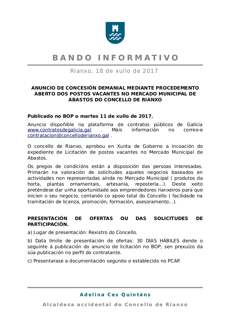 Publicado no BOP o martes 11 de xullo de 2017. Anuncio dispoñible na plataforma de contratos públicos de Galicia www.contratosdegalicia.gal . Máis información no correo-e contratacion@concelloderianxo.gal .