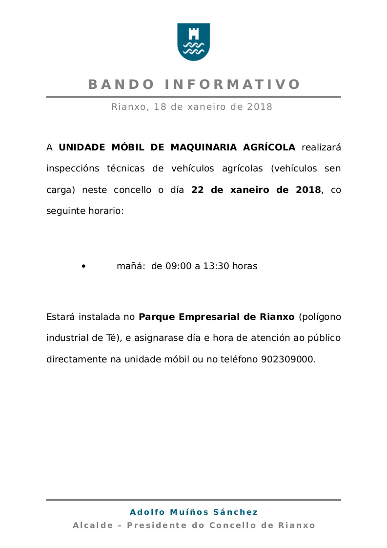 A UNIDADE MÓBIL DE MAQUINARIA AGRÍCOLA realizará inspeccións técnicas de vehículos agrícolas (vehículos sen carga) neste concello o día 22 de xaneiro de 2018, co seguinte horario: