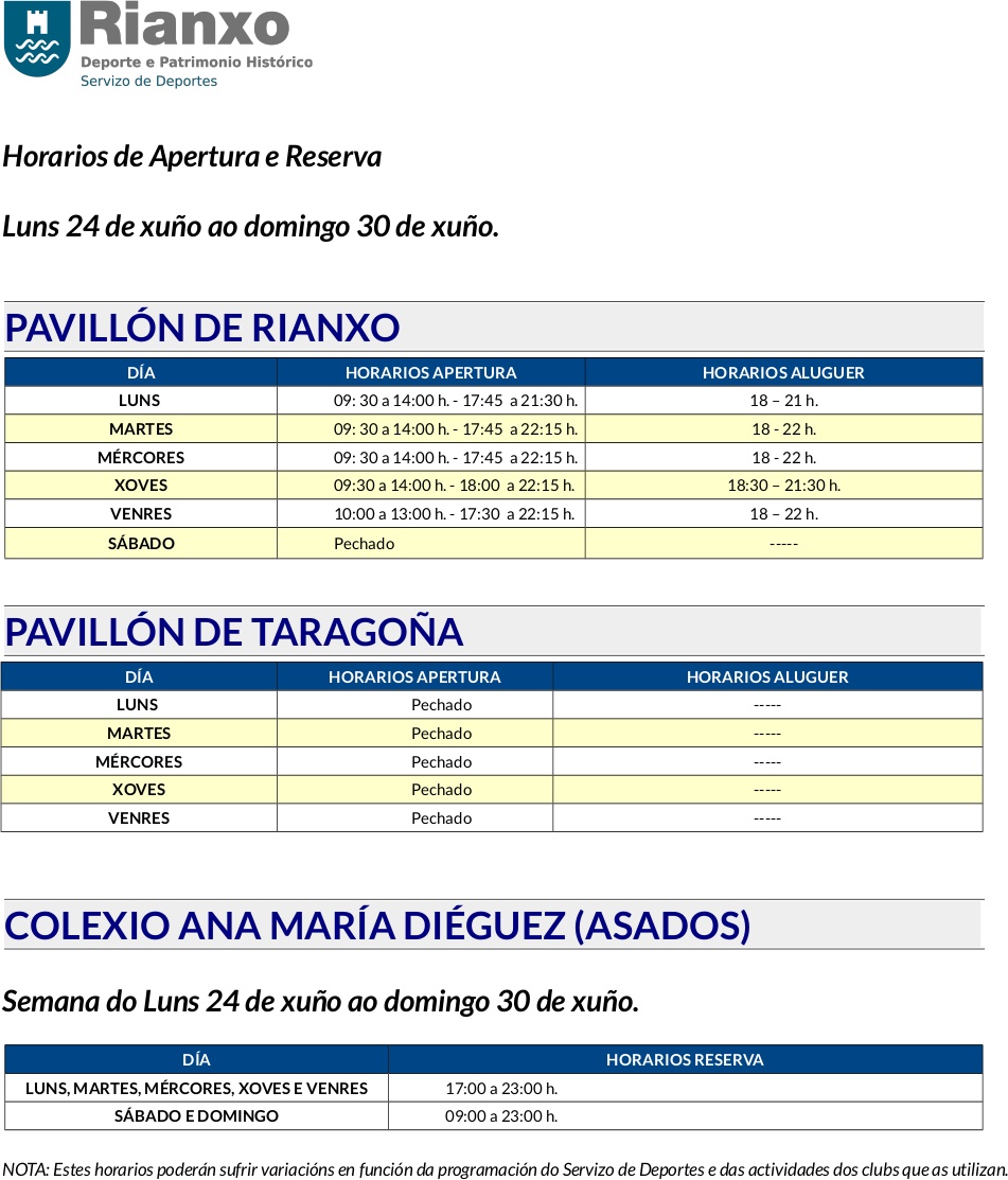 - Horario de apertura e aluguer dos pavillóns polideportivos do 24 ao 30 de xuño - Concello de Rianxo