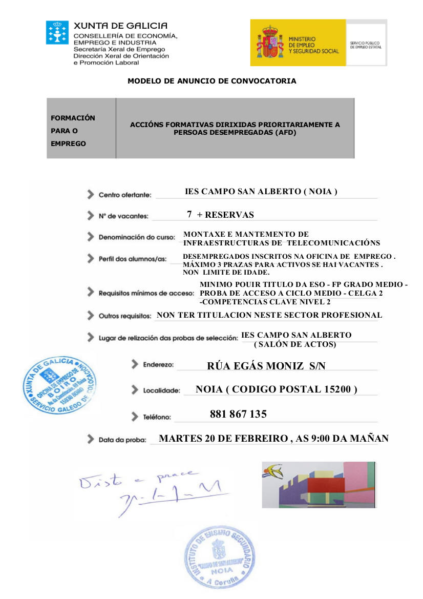 O IES Campo de San Alberto (Noia) vai impartir unha acción formativa dirixida, prioritariamente, a persoas desempregadas: