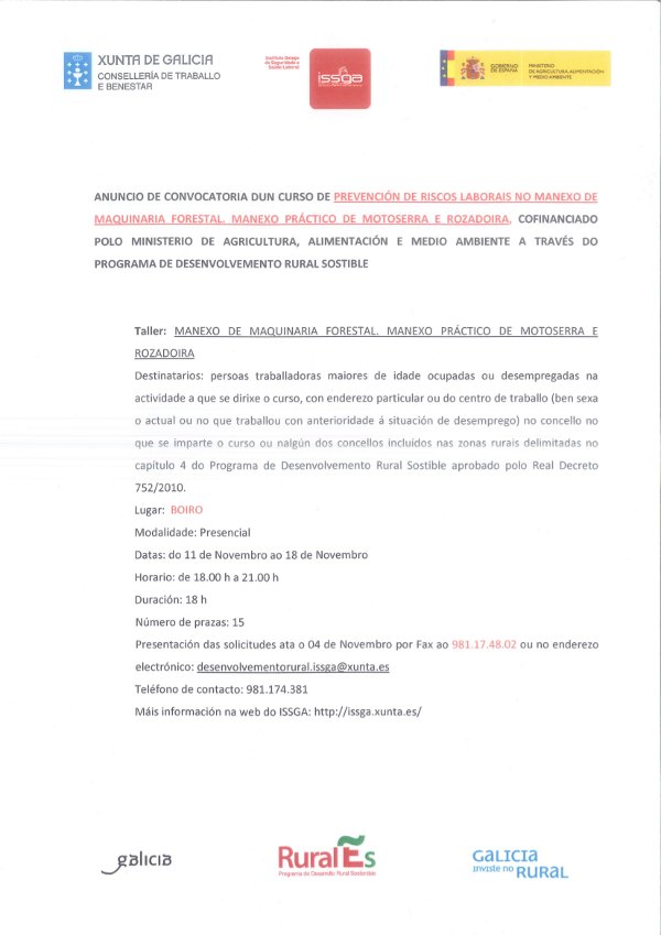 O Ministerio de Agricultura, Alimentación e Medio Ambiente a través do programa de desenvolvemento rural sostible vai realizar en Boiro o "Taller de Manexo de maquinaria forestal. Manexo práctico de motoserra e rozadoira". Este taller está destinado a persoas traballadoras maiores de idade ocupadas ou desempregadas na actividade a que se dirixe o curso.