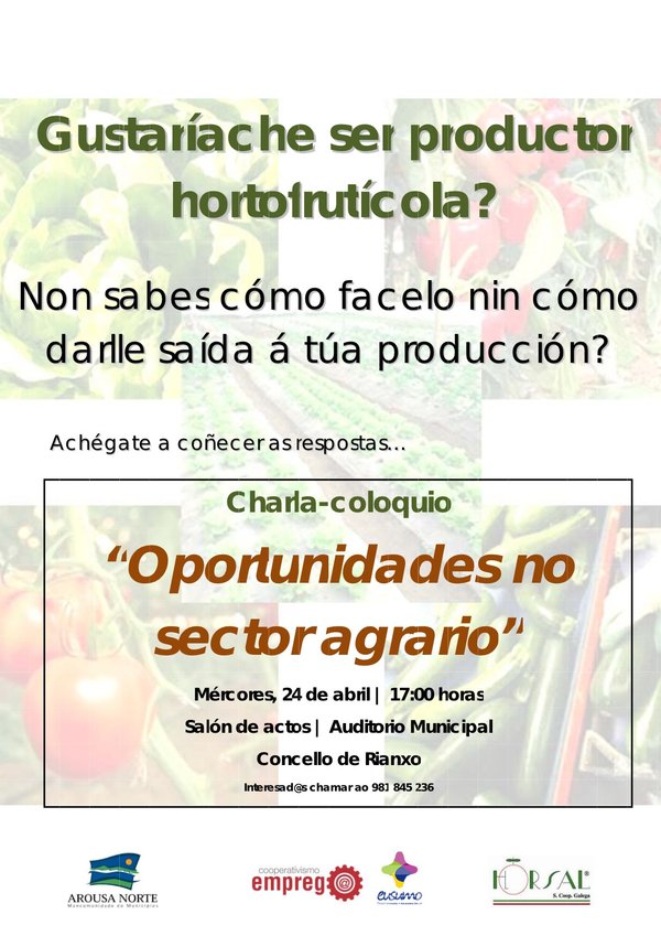 A primeira é unha Charla-coloquio sobre Oportunidades no sector agrario, na que a cooperativa Horsal virá a responder sobre as dúbidas que se lle plantexen sobre a posta en marcha de produccións hortofrutícolas, así como oportunidades que actualmente hai no mercado.