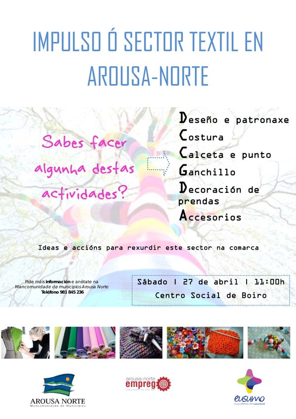 A outra actividades é unha charla sobre o Impulso do sector textil en Arousa Norte dirixida a todas as persoas con interese e experiencia no ámbito da creación de moda (deseño, costura, calceta/punto, ganchillo, decoración de prendas e accesorios), para aportar ideas e accións sobre un posible rexurdimento do sector textil a través dun proxecto a medio/longo prazo que aporte emprego e riqueza na comarca.