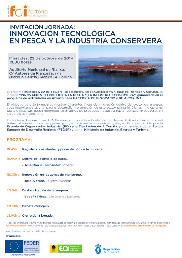 O día 29/10/2014, ás 19:00 horas, vaise celebrar no Centro Sociocultural - Auditorio de Rianxo a xornada "Innovación tecnolóxica en pesca e na industria conserveira" incluída no programa de actividades da Factoría de Innovación da Coruña.