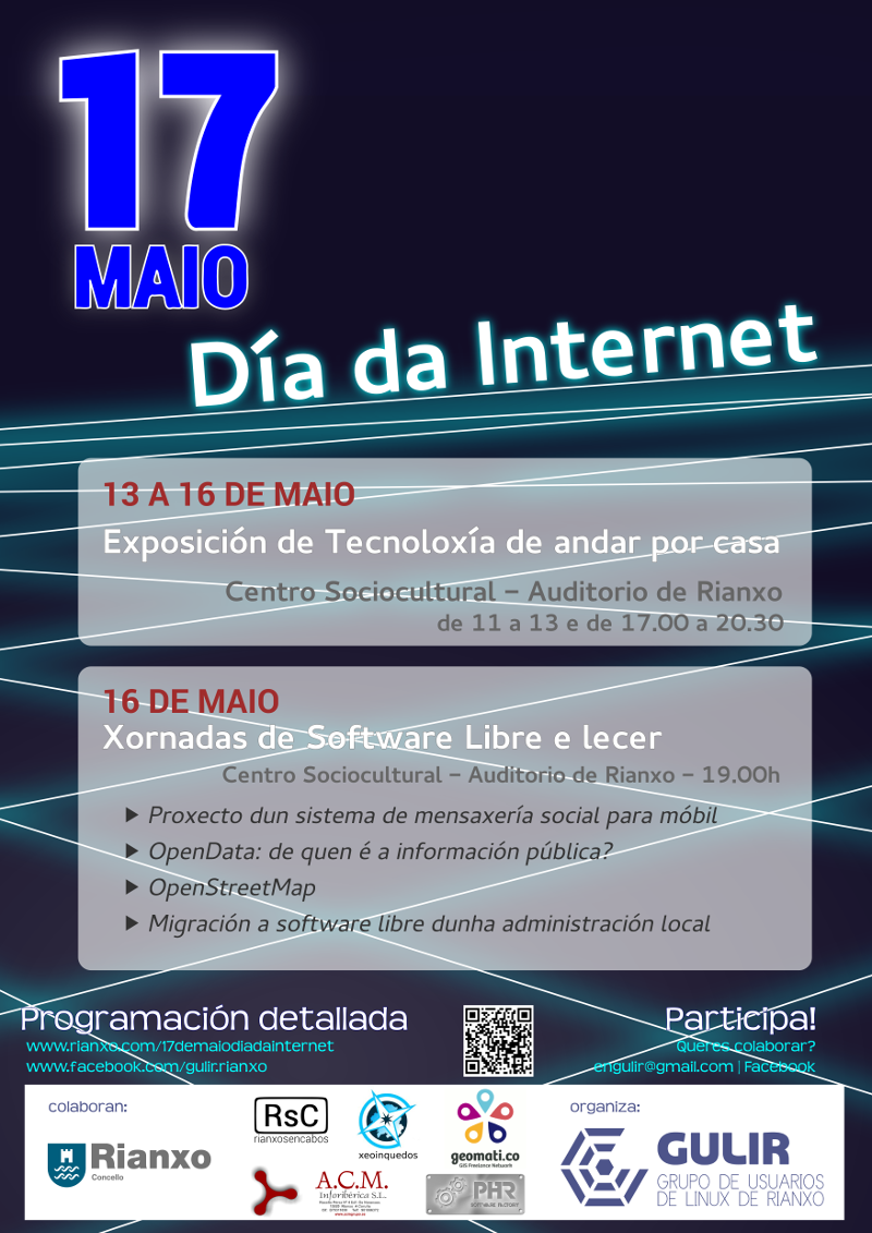 O GULIR (Grupo de usuarios de Linux de Rianxo) celebra o 17 de Maio, día da Internet, cunha exposición de aparellos feitos na casa e antigüidades e relatorios sobre software libre e as TIC. Máis información en http://www.rianxo.com/17demaiodiadainternet