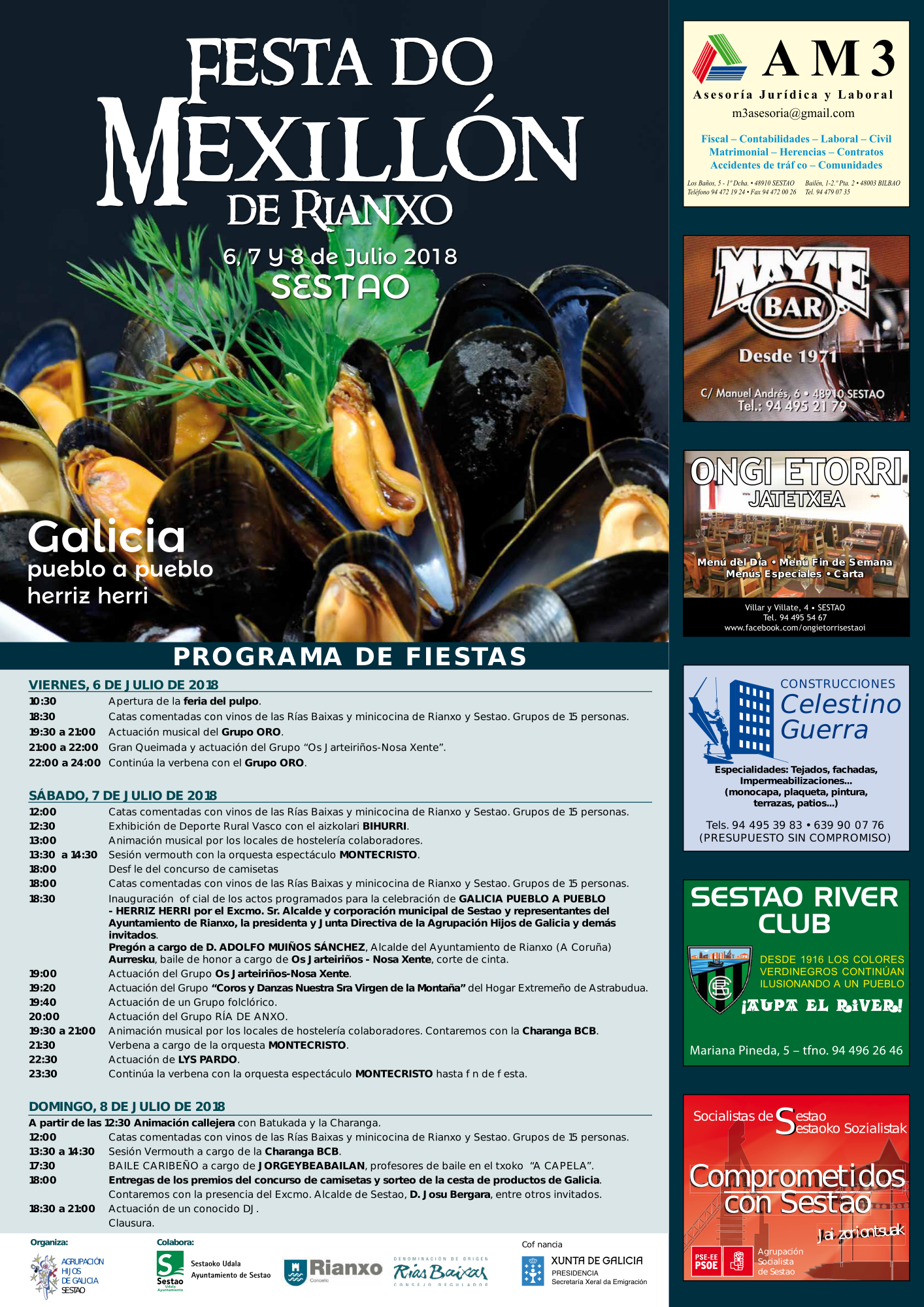 A Agrupación Hijos de Galicia de Sestao organiza a Festa do Mexillón de Rianxo en Sestao os días 6, 7 e 8 de xullo, coa colaboración dos concellos de Rianxo e Sestao e o Consello Regulador da Denominación de Orixe Rías Baixas, así como o cofinanciamento da Secretaría Xeral da Emigración da Xunta de Galicia.