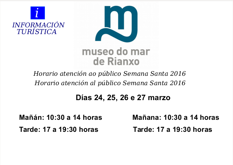 O horario de atención ao público do servizo de información turística durante a Semana Santa en Rianxo será de 10.30 a 14.00 e de 17.00 a 19.30 horas, no Museo do Mar e na Casa Museo de Manuel Antonio.