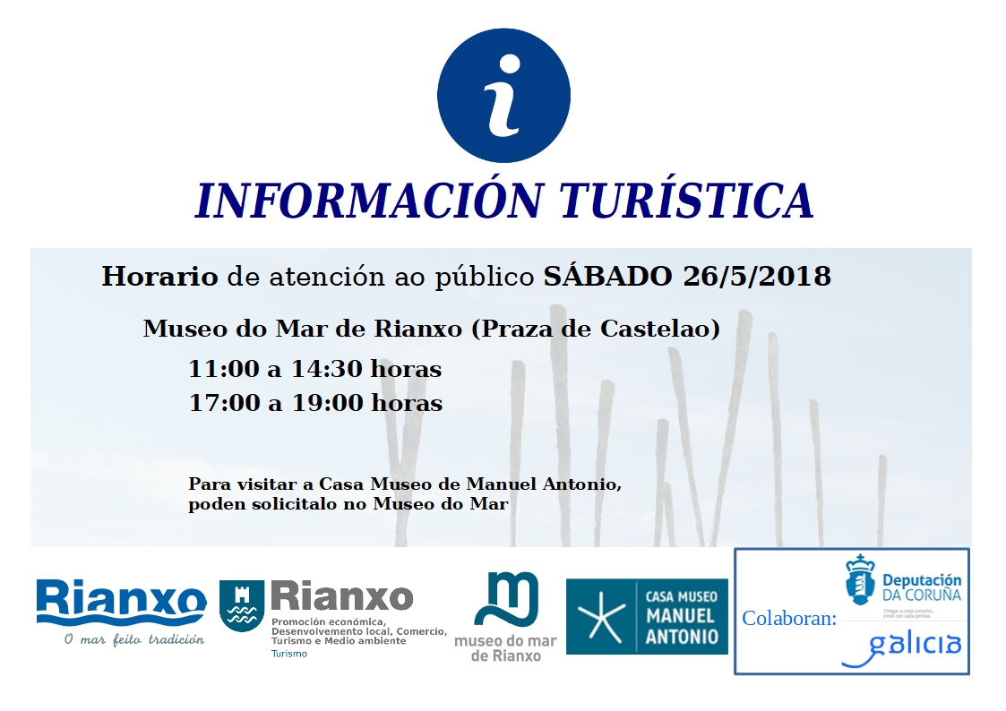 O servizo de información turística abrirá ao público este sábado, 26 de maio, no Museo do Mar de Rianxo en horario de mañá e de tarde. Neste lugar, ademais de consultar a información sobre Rianxo e visitar o propio museo, tamén se pode solicitar a visita á Casa Museo de Manuel Antonio.