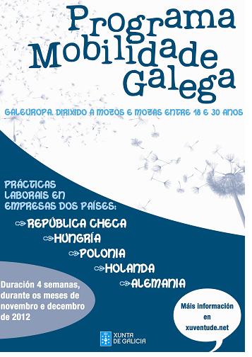 A Dirección Xeral de Xuventude e Voluntariado oferta 50 prazas para a realización de prácticas laborais no estranxeiro, dirixidas a mozos e mozas de 18 a 30 anos. Os paises de acollida serán Alemaña, República Checa, Hungría, Polonia, Irlanda e Holanda, e os sectores son hostalería, turismo, comercio, servizos á comuniade (atención á terceira idade e discapacidade) e administración. As prácticas realizaranse durante os vindeiros meses de novembro e decembro, cunha duración de 4 semanas.